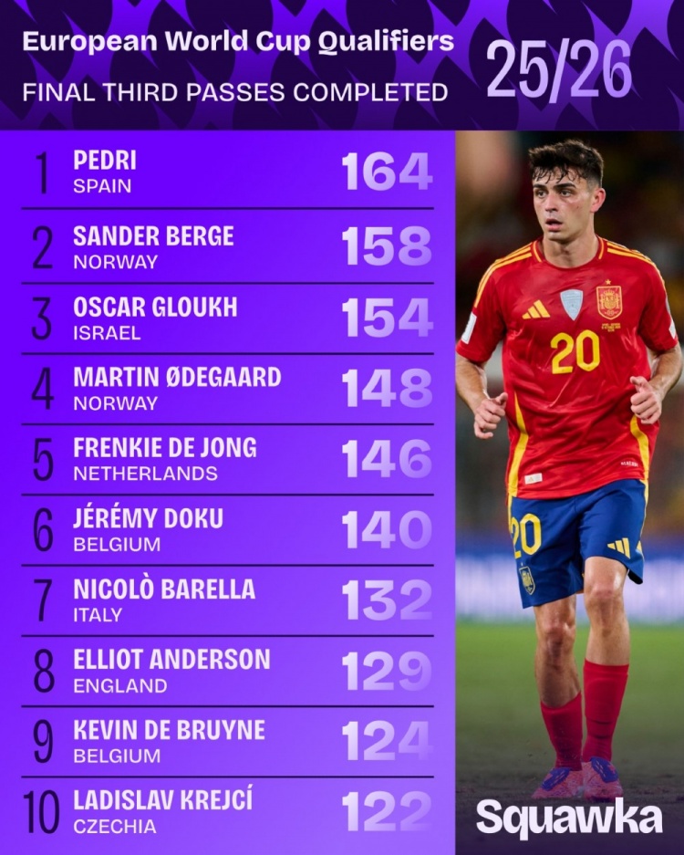 10月15日讯 Squawka列出了欧洲世初赛紧要三区到手传球排行,西班牙中场佩德里居首。