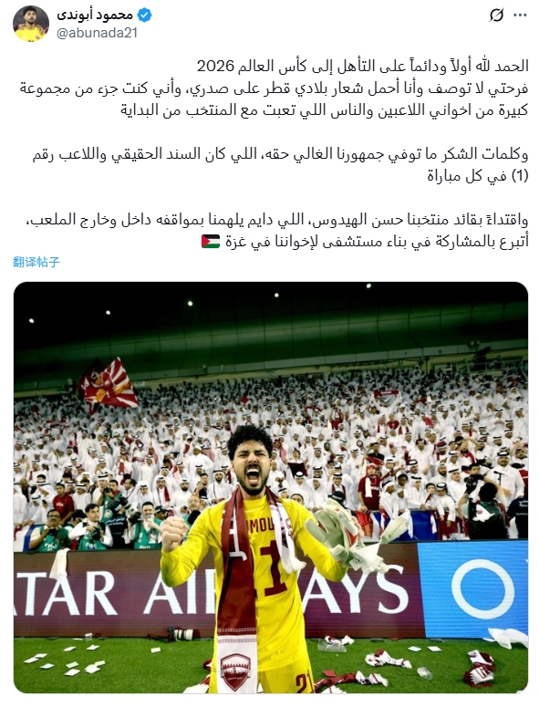 本日,卡塔尔国门马穆德-阿布纳德也发文:“我以国度队队长海多斯为榜样,不管在场上场下他齐弥远以当作激勉着咱们,我将捐钱为加沙的伯仲们建造一所病院。”