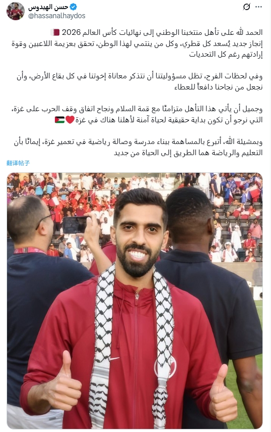 卡塔尔队长海多斯昨日发文:“我将捐钱,用于加沙重建中的一所学校和一座体育馆的成就,我笃信涵养和体育是通往腾达计的谈路。”