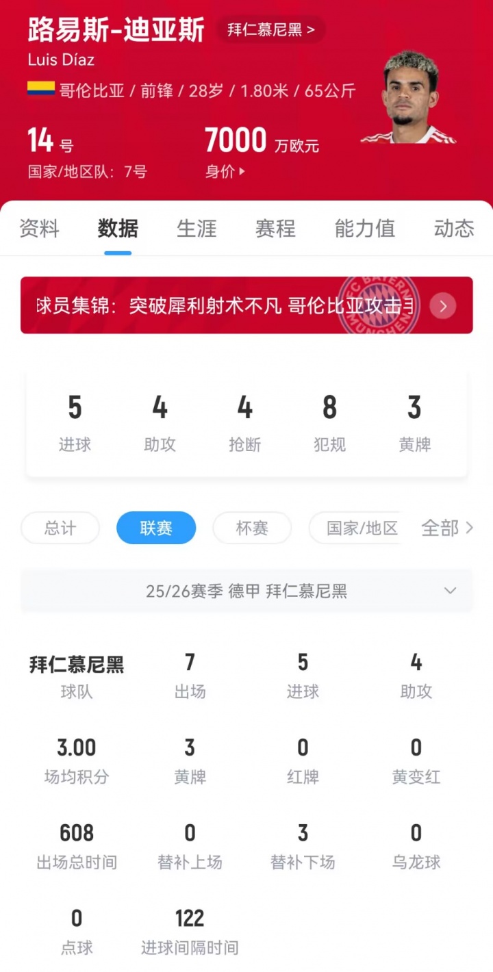 而夏窗总价7500万欧元离开利物浦,加盟拜仁的迪亚斯在更换环境后,仍保合手着火热的景色。他现在为拜仁在德甲出战7场比赛,孝敬5球4助,共平直参与球队9个进球。除了进攻端的推崇,迪亚斯刺眼时的积极性也获得了拜仁球迷的好评。