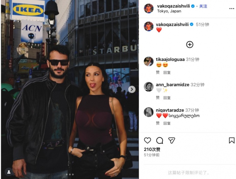 11月12日讯 本日,泰山队外助卡扎伊什维利更新社媒,晒出和太太欺诈海外比赛日的休赛期游览东京的相片。