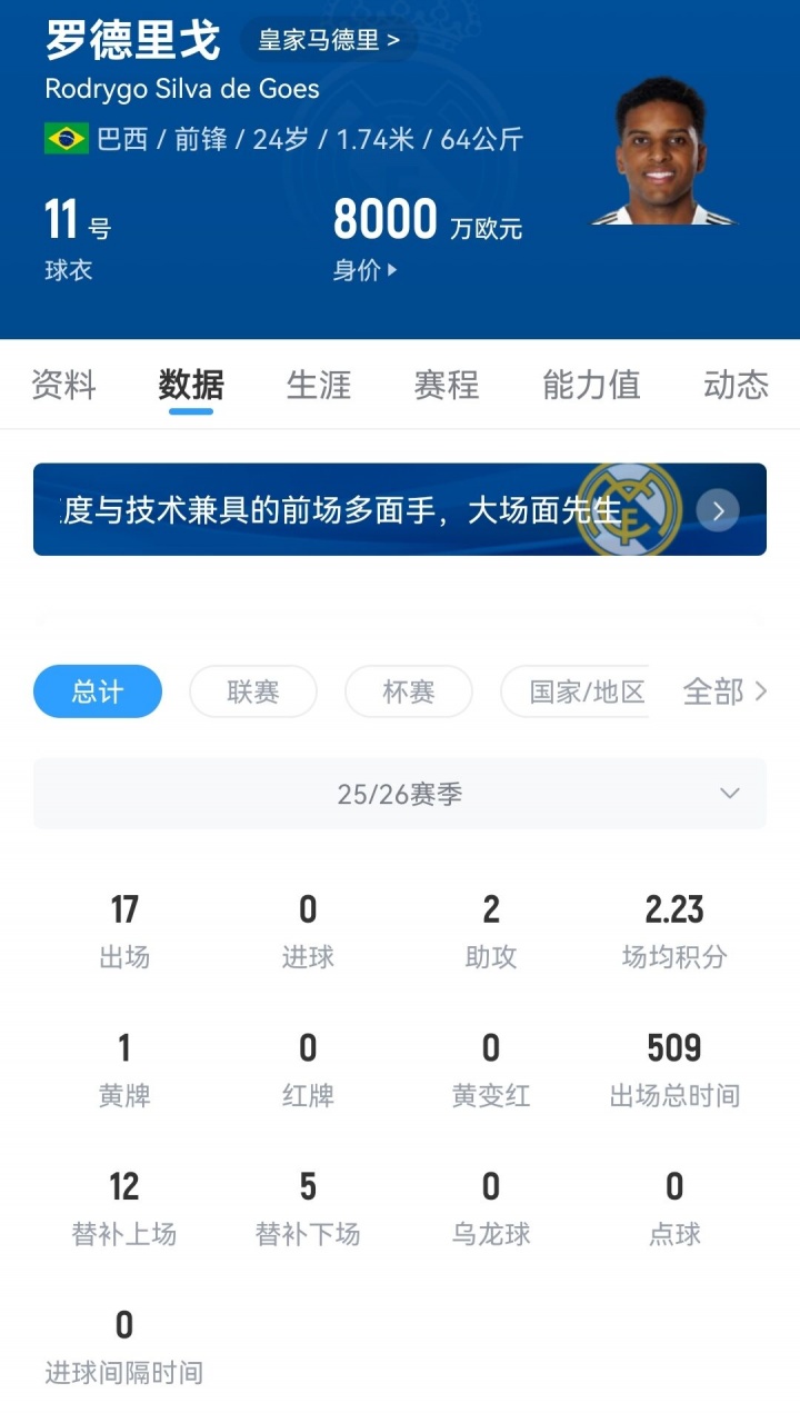 本赛季于今,罗德里戈为皇马出战14次认为416分钟,仅有4次首发,送出2次助攻,现在德回身价8000万欧。