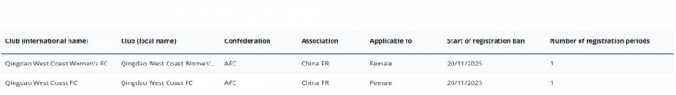 11月24日讯 左证国外足联官方信息,青岛西海岸新增两条女足转会禁令。