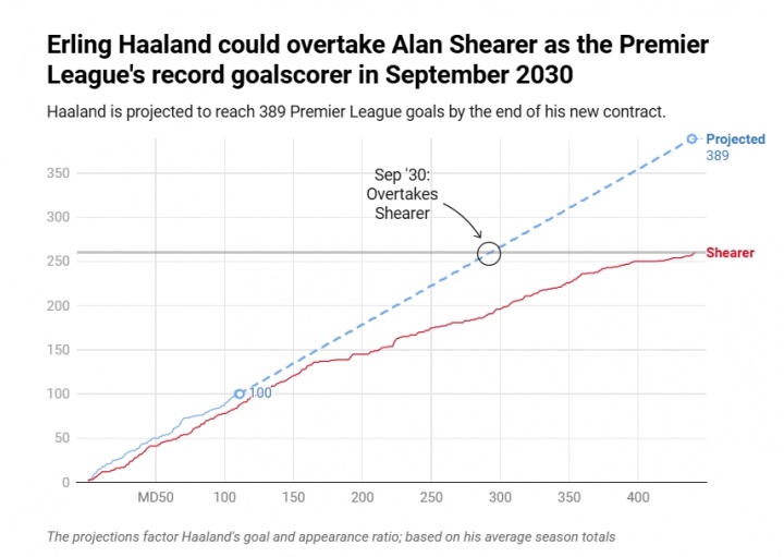 若是哈兰德能保握咫尺的风雅景象,直到他九年半公约戒指,他最终将达到389球——比希勒多129球。