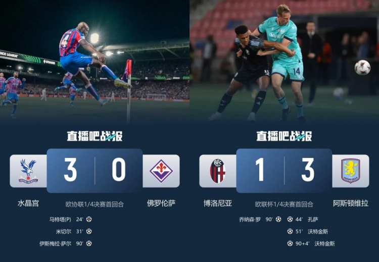 博洛尼亚主场作战 1-3不敌英超阿斯顿维拉,佛罗伦萨则是客场应战 0-3大败 给英超水晶宫。次局 两队翻盘概率极小,意甲球队很可能在8强战后全军覆没。