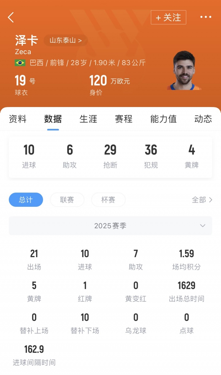 2024年加盟山东后,泽卡首个赛季遇到伤病困扰,2025年他终于迎来褂讪的出场,21场比赛孝敬10球7助。