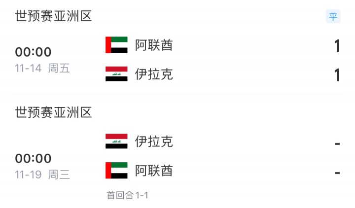 世初赛亚洲区第五阶段首回合,伊拉克与阿联酋1-1战平,未来两边将迎来第二回合的较量。