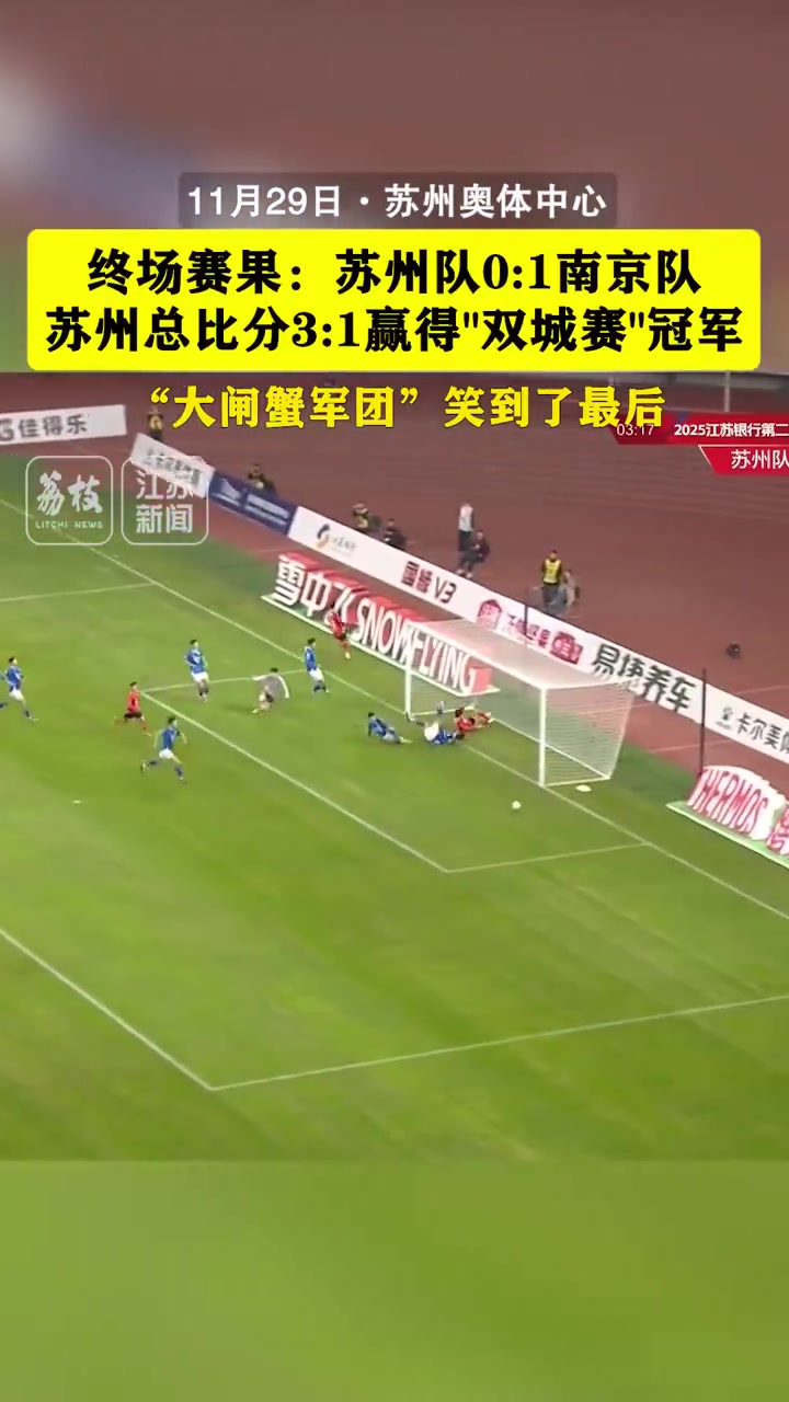 11月30日讯 苏州队在第二届江苏省足球发展重心城市抵抗赛(双城赛)中,首回合客场3:0胜南京队,次回合主场虽0:1小负南京,仍以两回合总比分3:1得手卫冕。