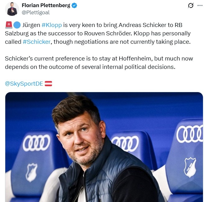 10月30日讯 记者Florian Plettenberg报说念,红牛人人足球总监克洛普额外渴慕为萨尔茨堡红牛引进霍芬海姆总监希克尔,以接替施罗德。