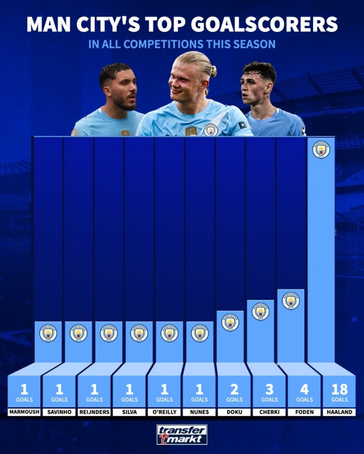 11月6日讯 欧冠联赛阶段第四轮比赛,哈兰德破门,曼城主场4-1打败多特,德国转会市集列出了本赛季曼城队内弓手榜,哈兰德18球居首,其他球员所有这个词打进15球。