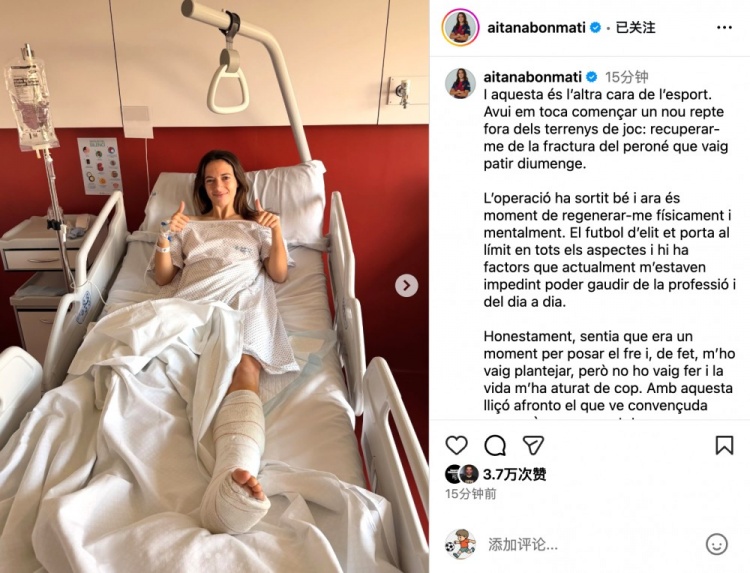 12月2日讯 邦马蒂在西班牙女足集训时期恶运遇到腓骨骨折。巴萨官方秘书,邦马蒂已奏效收受左腓骨经骨过错骨折手术。邦马蒂刚刚更新搪塞媒,晒出手术后相片并发长文暗示手术已凯旋完成,我方将会再行归来。