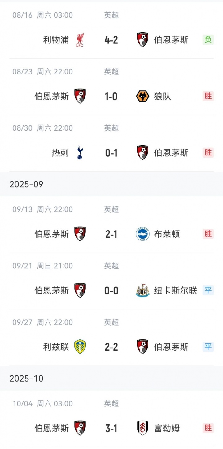 10月04日讯 今天凌晨英超第7轮先赛一场,伯恩茅斯主场3-1力克富勒姆,联赛近6轮不败暂升至积分榜第2位。