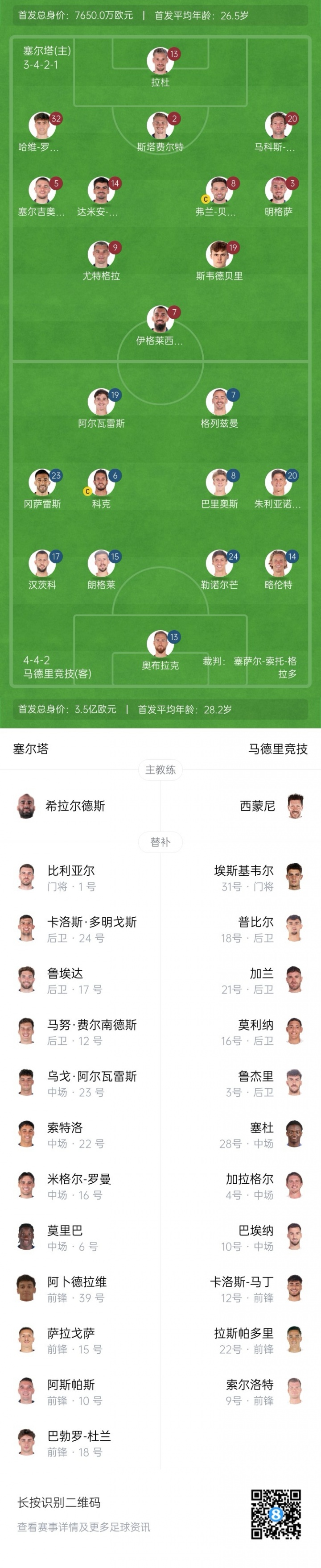塞尔塔首发:13-拉杜、20-马科斯·阿隆索、2-斯塔费尔特、32-哈维·罗德里格斯、3-明格萨、8-弗兰·贝尔特兰、14-达米安·罗德里格斯、5-塞尔吉奥·卡雷拉、19-斯维贝里、9-尤特格拉、7-伊格莱西亚斯