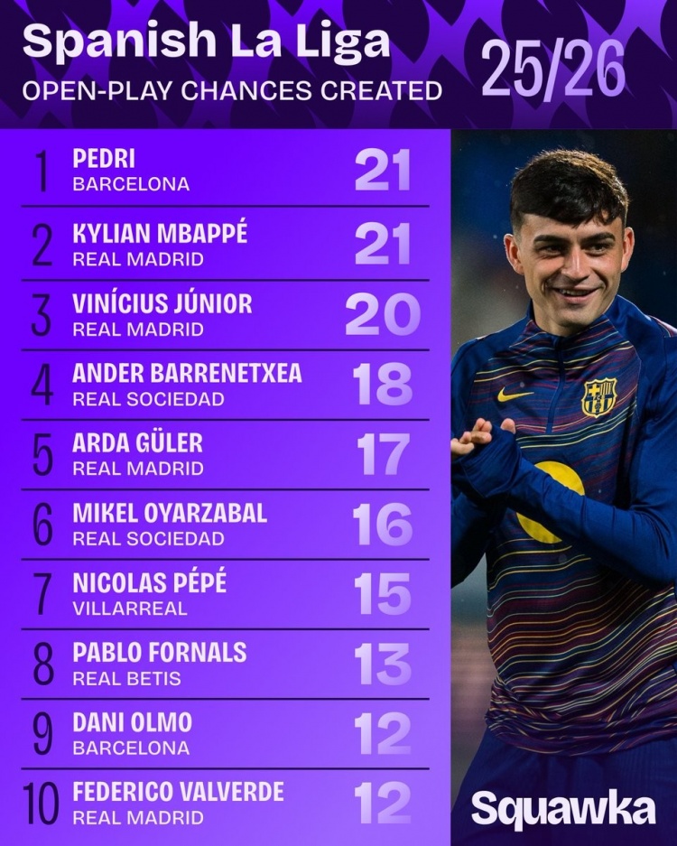 10月16日讯 日前,Squawka统计了本赛季西甲通顺战创造契机名次,