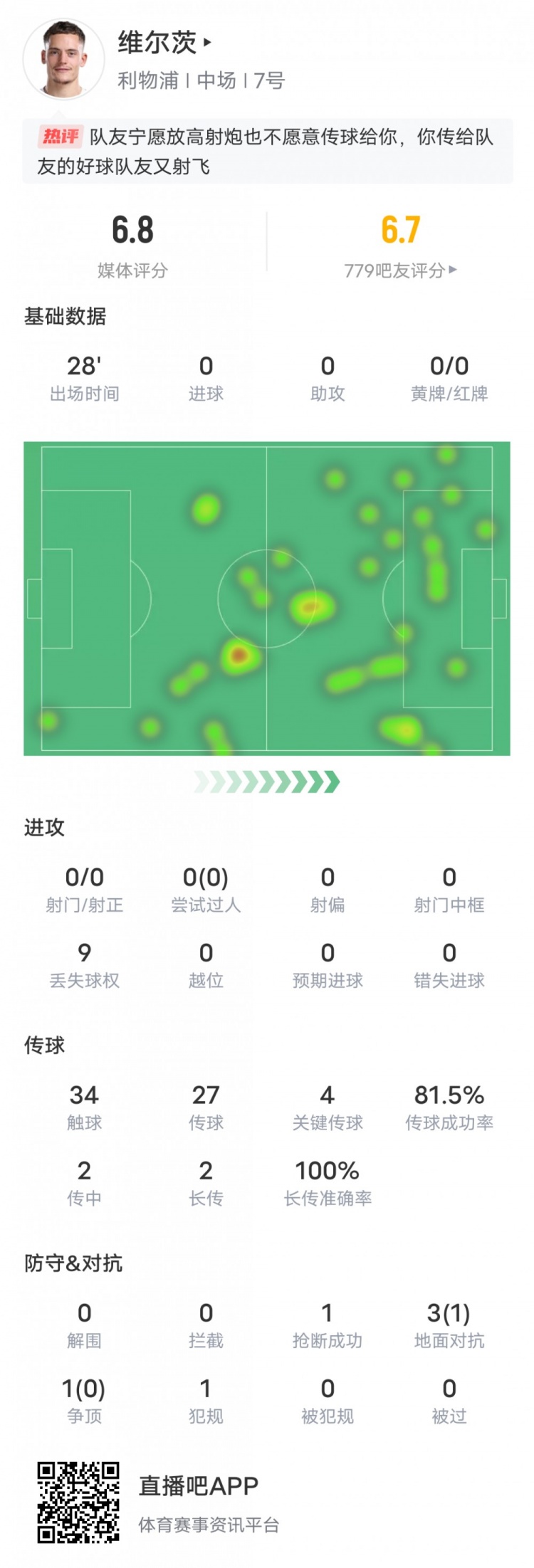 本场比赛,利物浦中场维尔茨替补出战28分钟,射门、过东谈主、阻挠数据挂零。