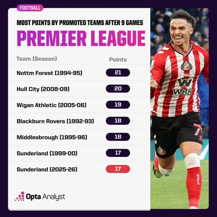 哪怕你是想象力格外丰富的球迷,揣测也不会在接洽新赛季英超排行时,把升班马放在前哨。这项赛事素来竞争浓烈,既有 BIG6 权门镇守,也有不少新贵争夺欧战资历,对新球会来说的确很 “不友好”。不外桑德兰却 “不这样想”,上赛季他们在英冠(二级赛事)打出佳绩到手升级后,本赛季更进一步,9 轮战罢位列前四,真实令东说念主大跌眼镜,黑猫是真不好惹!