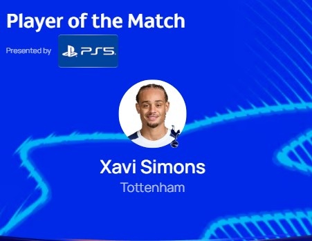 本场比赛哈维-西蒙斯说明不俗,孝顺1次助攻,4次要道传球,赛后他也当选欧冠官方评比出的本场最好球员。