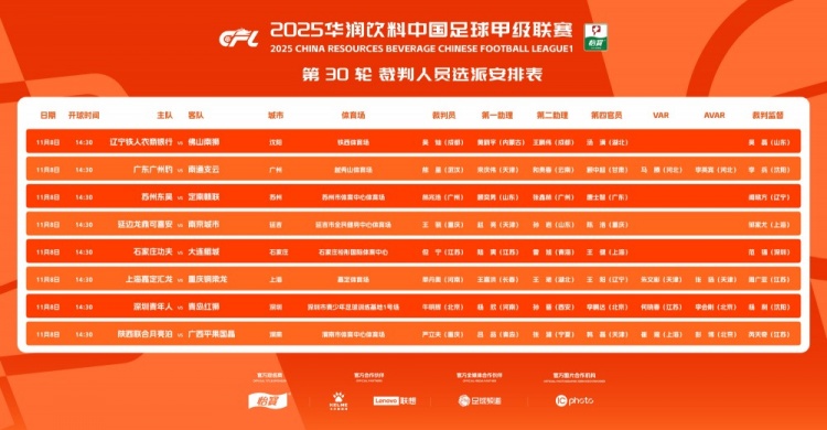 11月8日讯 中甲第30轮裁判遴派服从公布,其中广东广州豹vs南通支云、上海嘉定汇龙vs重庆铜梁龙、深圳后生东说念主vs青岛红狮、陕西纠合vs广西平果4场比赛安排有VAR裁判。