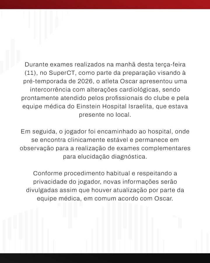 动作备战 2026 年季前赛的一部分,在本周二(11日)上昼于 SuperCT 进行的查验中,指点员奥斯卡出现腹黑至极情况,当场由俱乐部专科东说念主员及现场的以色列埃因斯坦病院医疗团队宏大救治。随后,球员被转送至病院,当今临床情况踏实,并留院不雅察以进行进一步查验明确会诊。按照老例并尊重球员阴事,后续信息将在医疗团队与奥斯卡共同答允后实时更新。