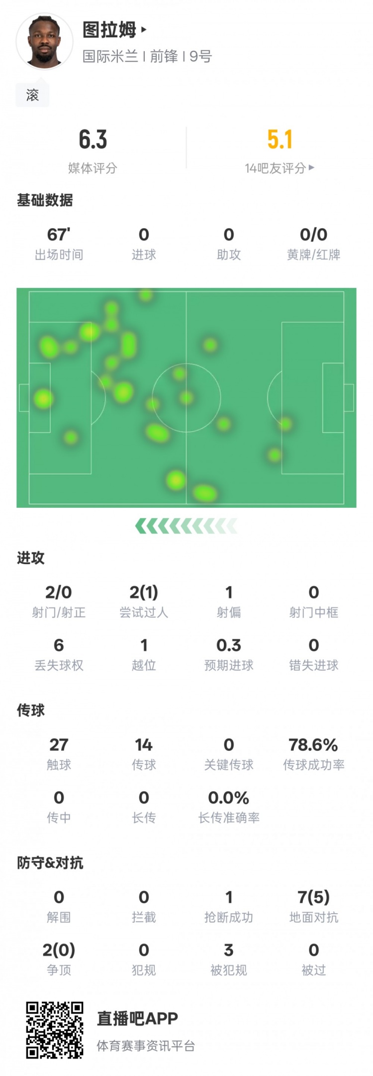 11月30日讯 2025-26赛季意甲第13轮,国米客战比萨,图拉姆先发出战,2射门0射正,2次过东谈主1次到手,7次大地反抗5次到手,评分6.3。