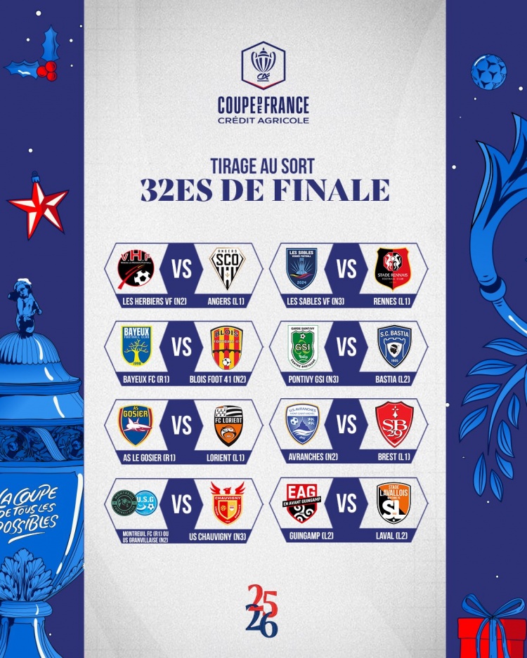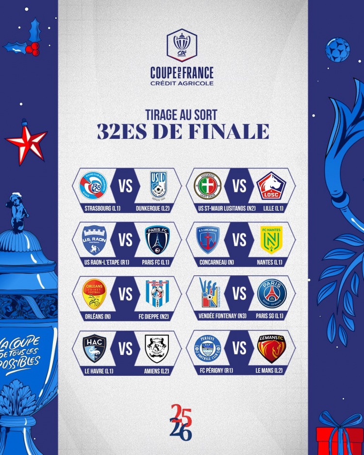 12月2日讯 法国杯32强抽签后果出炉,巴黎圣日耳曼将赶赴客场挑战法国宇宙丙组联赛的旺代丰特奈。