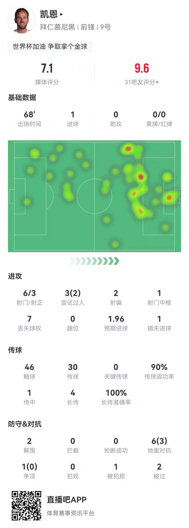 10月23日讯 拜仁在本轮欧冠3-0卓著布鲁日,凯恩本场数据如下: