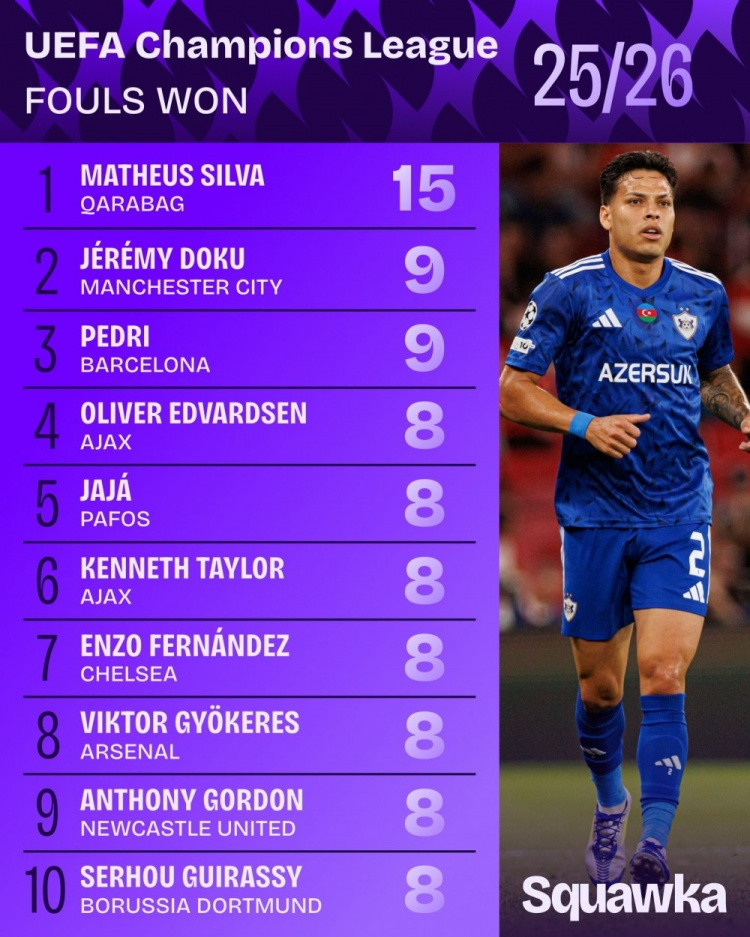直播吧10月23日讯本赛季欧冠联赛阶段已战罢3轮,Squawka统计了到现在领域的被犯规榜单,卡拉巴赫后卫马修斯-席尔瓦15按序一,曼城边锋多库和巴萨中场佩德里均9次,分列二三位。