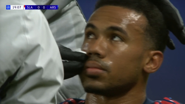 11月05日讯 欧冠阿森纳vs布拉格斯拉维亚第18分钟,加布里埃尔被击中面部,队医惩办后延续比赛。