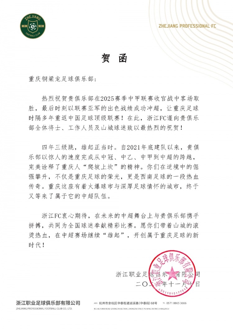 厉害道喜贵俱乐部在2025赛季中甲联赛收官战中客场取胜,临了时辰以联赛亚军的出色战绩得手冲超,让重庆足球时隔多年重返中国足球顶级联赛!在此,浙江FC谨向贵俱乐部合座将士、职责主谈主员及山城球迷致以最厉害的道喜!