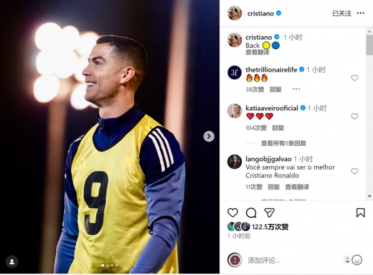 C罗更新社媒动态,晒出回顾利雅得告捷考验的像片,配文:“归队。”