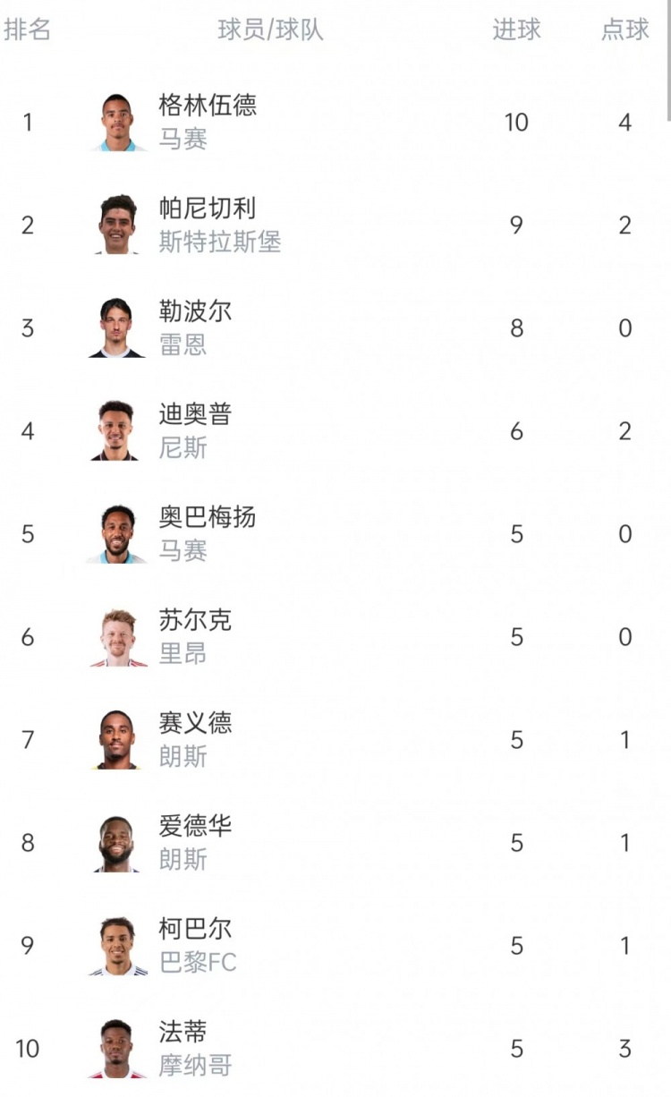 格林伍德本赛季出战12场法甲比赛,打进10球,登顶法甲弓手榜。