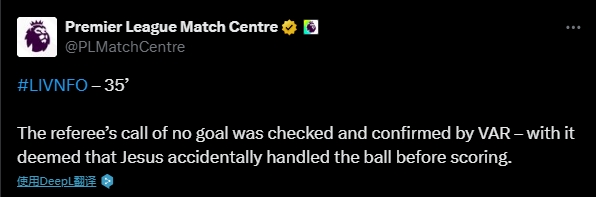 英超官方解说这一判罚:裁判判罚进球无效,历程VAR裁判证据,热苏斯进球前失慎用手触球。