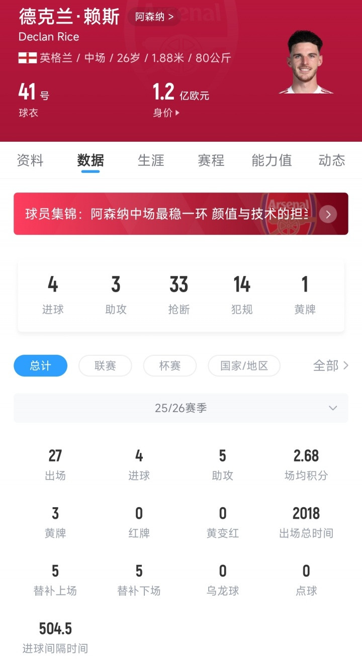 2023年夏窗赖斯以1.17亿欧元的转会费,从西汉姆联加盟阿森纳,于今代表枪手130场比赛孝顺20球27助。现在26岁的赖斯德回身价为1.2亿欧元,他与阿森纳的契约还有2年半到期。