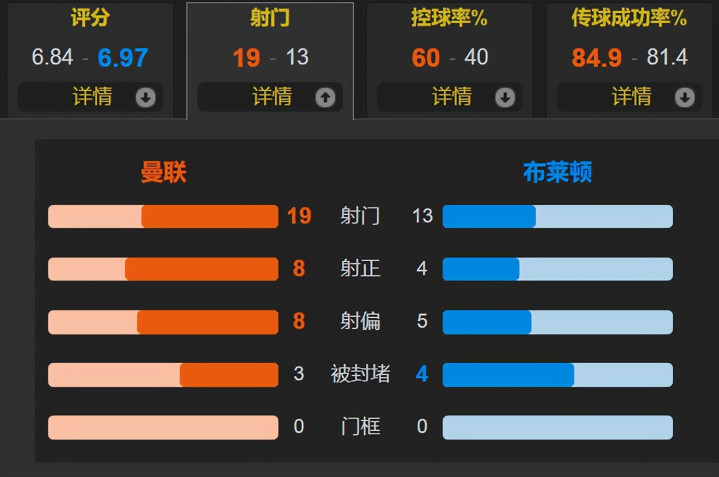 曼联主场占据更多的控球率、射门次数和射正次数,但得宠不得分,照旧输球的一方。此役,曼联的控球率为六成,一共有19次射门,其中8次射正;而布莱顿有13次射门,其中4次射正。