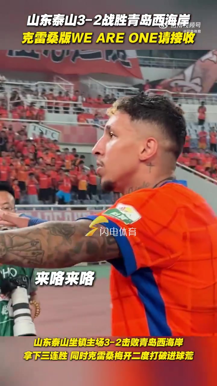 据“闪电新闻”报说念,赛后克雷桑与泰山球迷情谊互动,演出克雷桑版WE ARE ONE!
