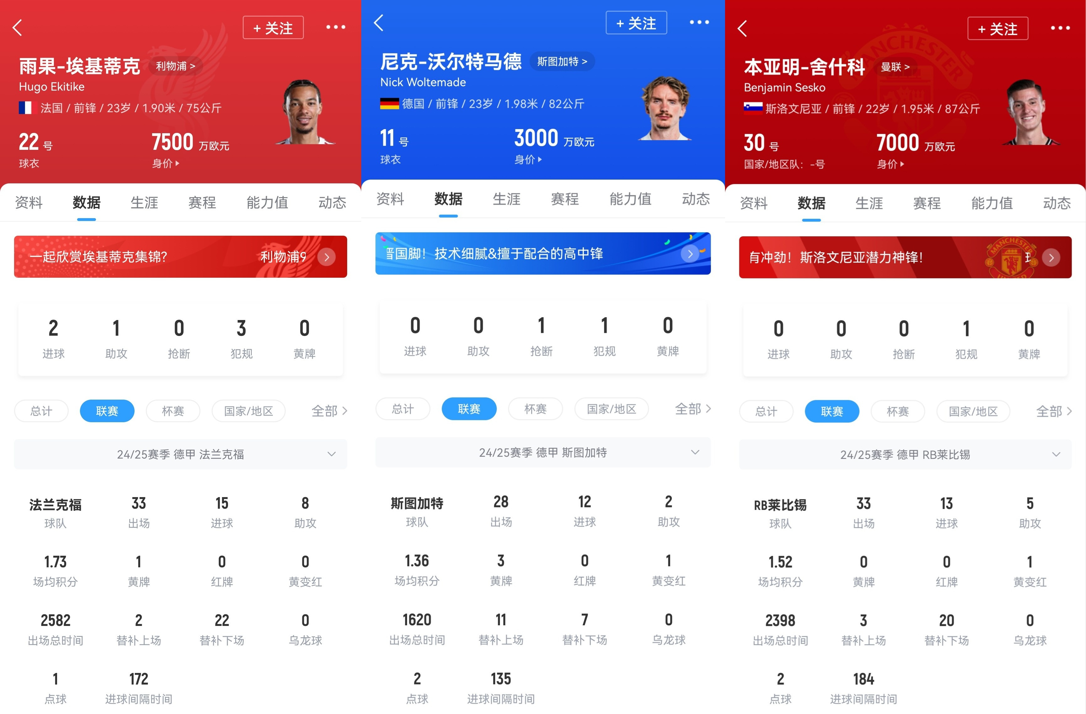 埃基蒂克德甲33场15球8助转会费8000万固定+1500万浮动(1000万容易达成)